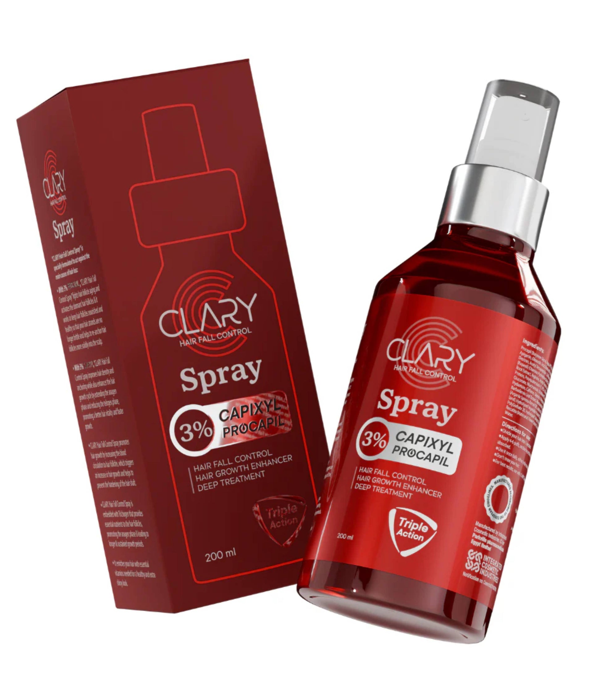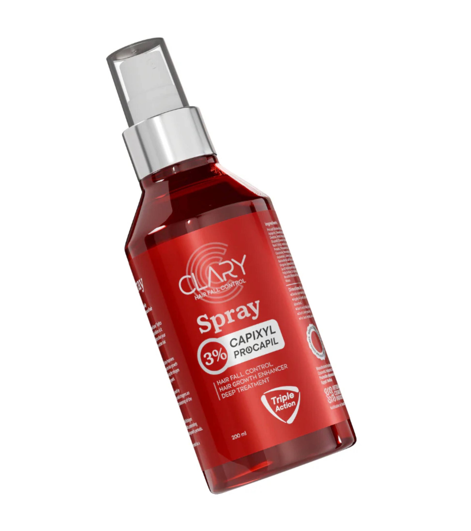 اسبراي كلاري للتحكم في تساقط الشعر يجمع بين 3% Procapil و3% Capixyl لمكافحة شيخوخة بصيلات الشعر، تنشيط البصيلات الخاملة، وتحسين كثافة الشعر.