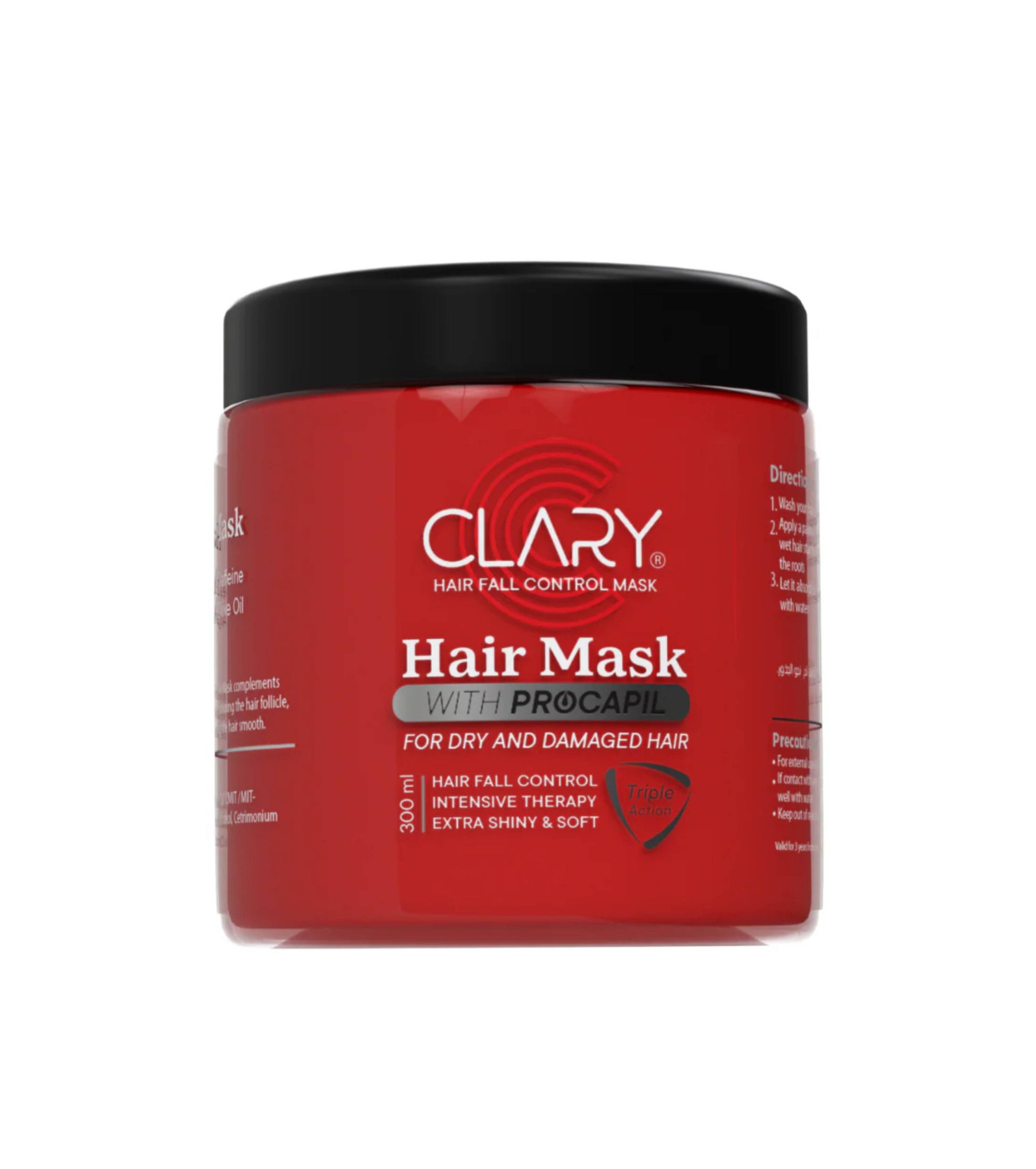 يحتوي ماسك كلاري على مكونات غنية وفعّالة تغذي الشعر، تنعمه، تصلحه، وتسمح له بالتنفس. كما أن ماسك كلاري، المعزز بنسبة 3% Procapil، يكمل روتين العناية بالشعر، مما يساعد على تثبيت بصيلات الشعر ويتركه ناعمًا ولامعًا