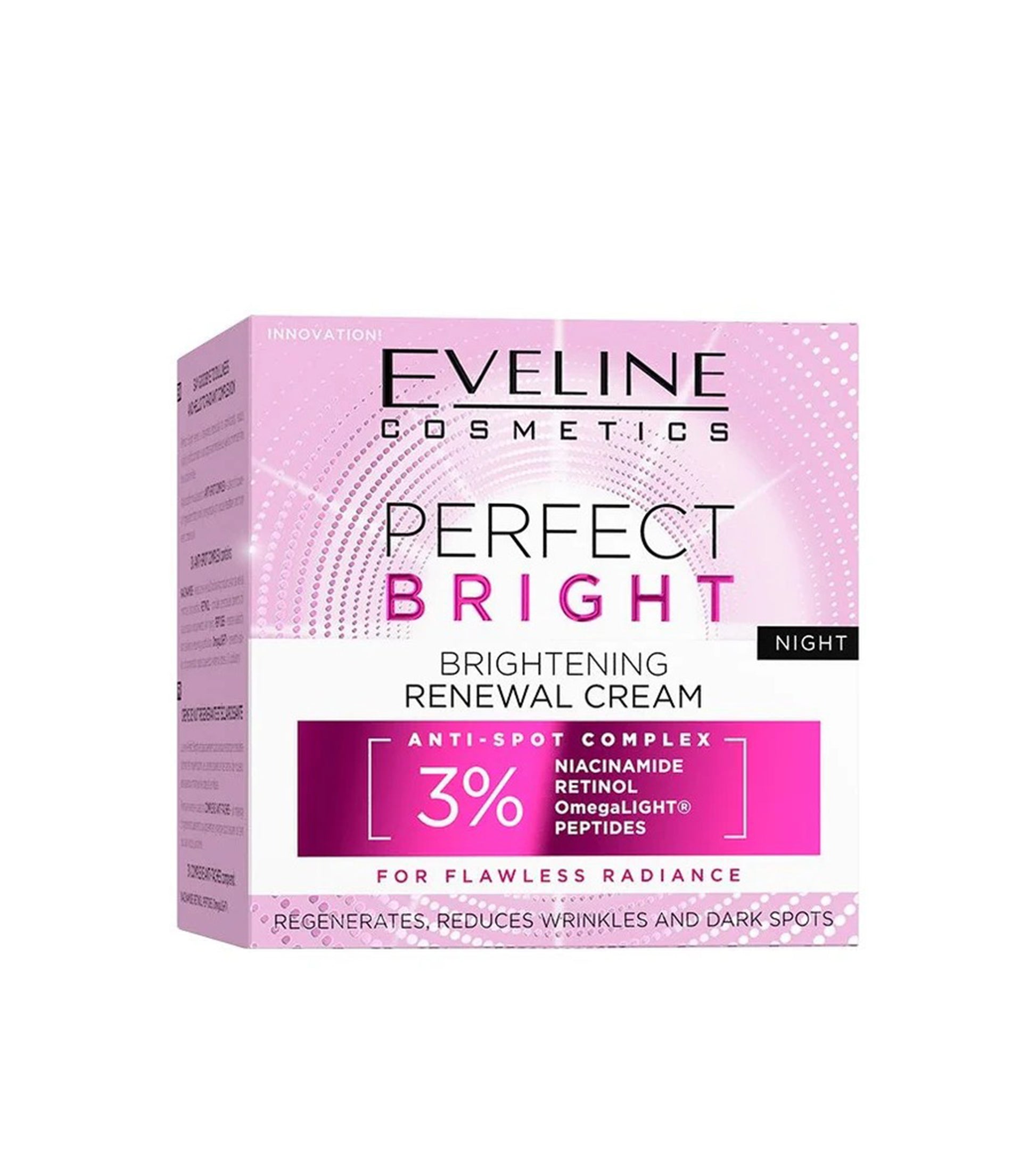 عناية مكثفة تعمل على تفتيح وتجديد البشرة أثناء النوم، يحتوي على مركب مضاد للبقع 3% لمحاربة فرط التصبغ بفعالية، ويغذي البشرة بمكونات نشطة مثل النياسيناميد، الريتينول، أوميغا لايت® والبيبتيدات لاستعادة الإشراقة، توحيد اللون، ومنح البشرة مظهرًا شابًا