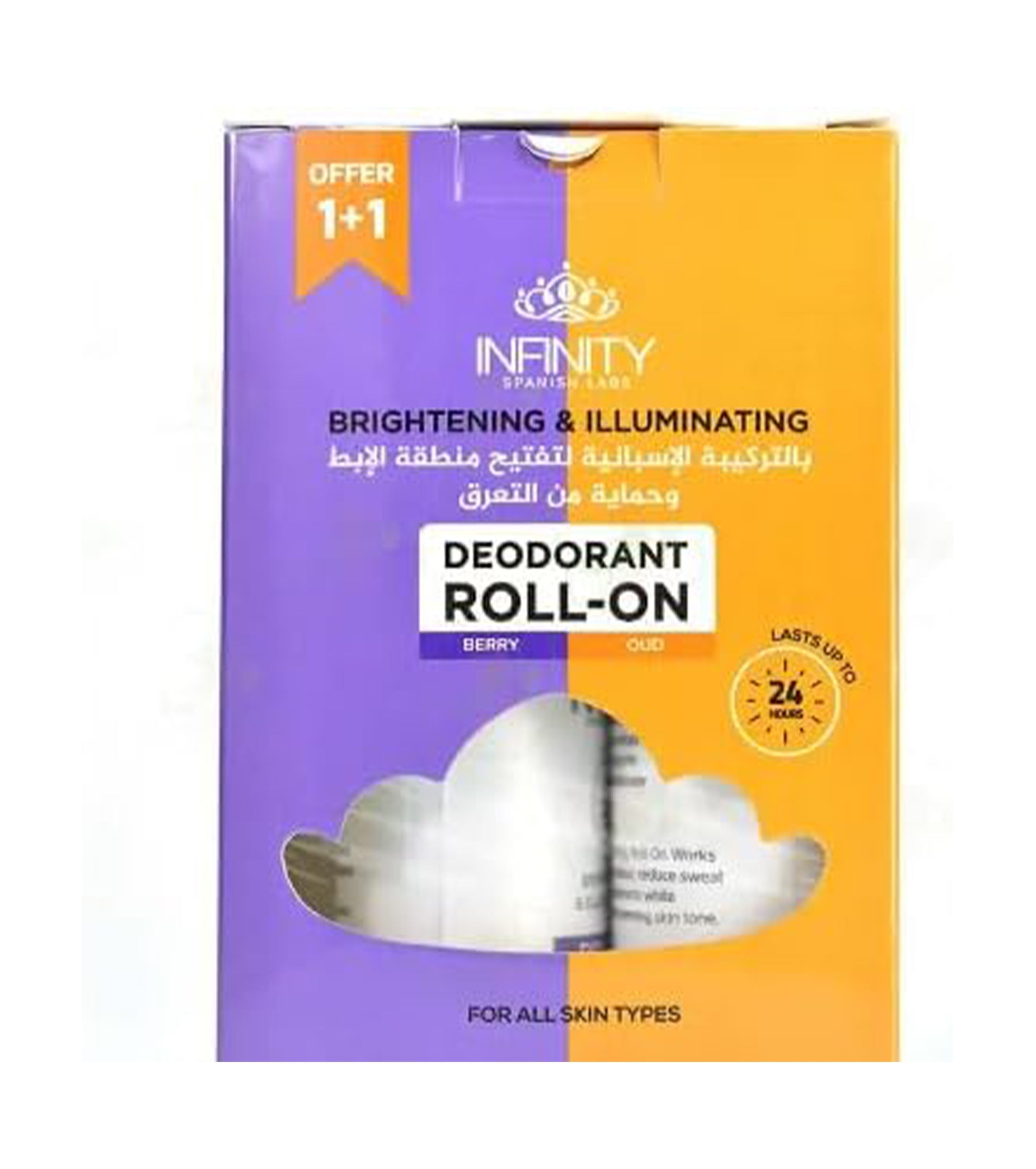 رول أون إنفينيتي للتفتيح يعمل على التخلص من البقع الداكنة وتوحيد لون البشرة مع توفير حماية تدوم 24 ساعة ضد رائحة الجسم وتقليل التعرق وتهدئة منطقة تحت الإبط
