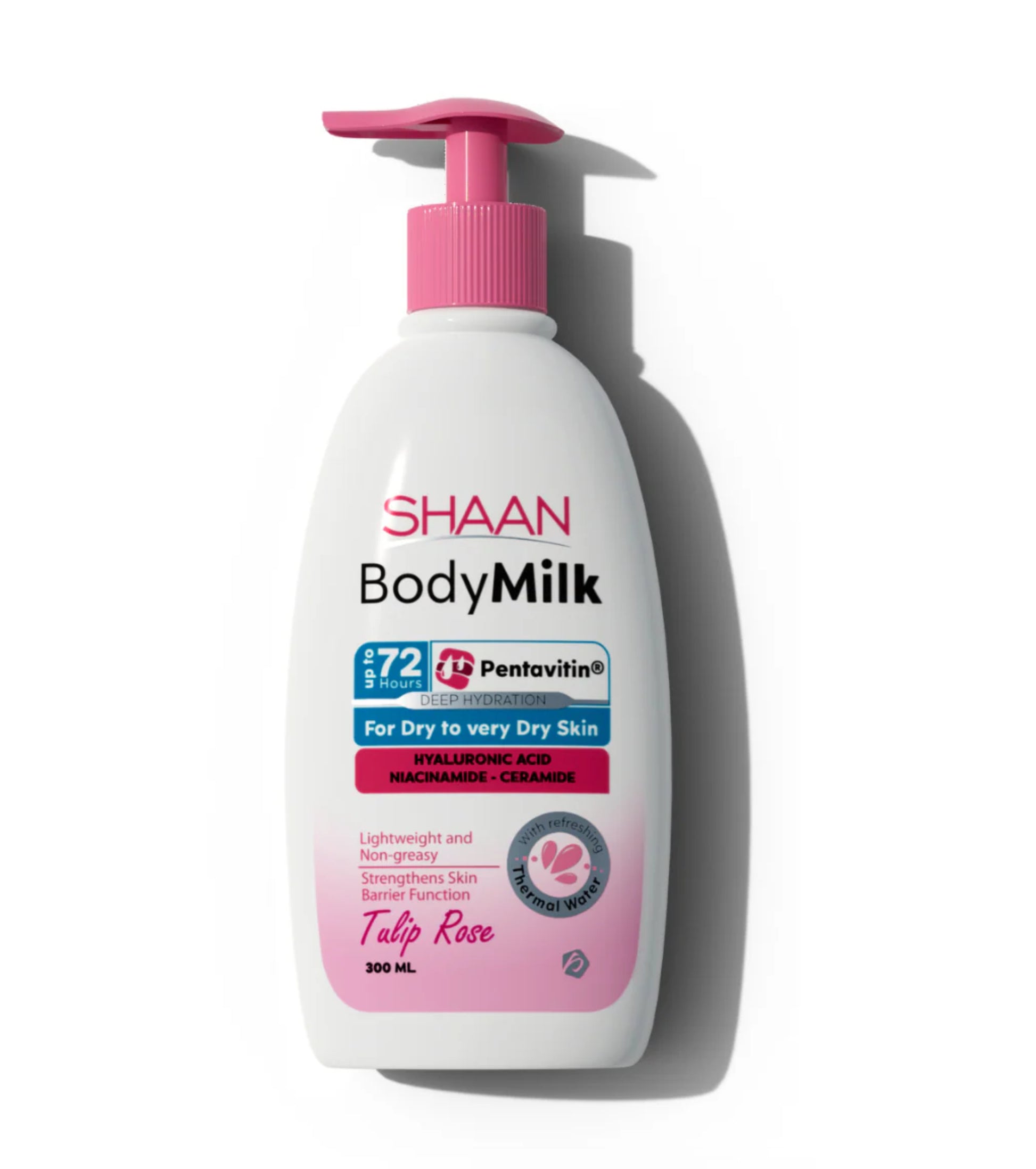 Shaan Body Lotion Tulip Rose يوفر ترطيباً عميقاً للجسم يدوم حتى 72 ساعة. مناسب لجميع أنواع البشرة.